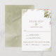 Tarjeta de RSVP elegante con la posibilidad de agregar opciones de comida en la parte inferior o un mensaje personal para los invitados. Manchas de acuarela verde suave que encierran la tarjeta y exquisito detalle de hojas de palmera de acuarela, follaje y flores en la esquina derecha. Diseño en tonos verdes, oliva, blanco, crema, melocotón, lavanda y lila. Parte posterior con textura de acuarela verde elegante. Parte de nuestra "Colección Verde Floral de Hojas de Palma" con una variedad de productos coordinados disponibles.