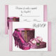 Plantilla de invitación para fiesta de cumpleaños de zapatos de tacón alto y leopardo rosa caliente para mujer. Esta elegante caja de encaje rosa y negro con rosas, perlas y zapatos de tacón alto de leopardo rosa funciona bien para cualquier cumpleaños de niña o mujer o evento. Personalízalo para tu fiesta o evento agregando los detalles de tu evento, estilo de fuente, tamaño y color de fuente, y redacción en la parte delantera y trasera.