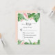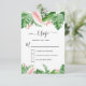 Tarjetas de confirmación de boda de primavera o verano con hojas de palma verde tropical y flores florales rosadas acuerela - incluye una tipografía de letra elegante y hermosa con flores botánicas tropicales modernas y vegetación para la celebración del día especial de la boda.