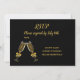Una tarjeta de confirmación de boda elegante y con estilo que presenta un tema de copas de champán en negro y dorado. El texto personalizable está en escritura elegante sobre un fondo negro. Esta tarjeta presenta dos copas de champán burbujeantes en un brindis por la nueva pareja. Un diseño simple y elegante para su día especial. Busque las invitaciones a juego en el mismo estilo.