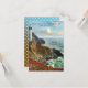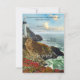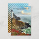 Tarjeta de confirmación con una pintura de una costa con un faro en colores vibrantes. Esta tarjeta de confirmación coincide con las invitaciones de boda. Hermosa para una boda de playa o destino.