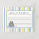 Estas adorables tarjetas de consejo escritas para animales de lana Frog Turtle Bee Dragonfly son la adición perfecta a cualquier ducha de bebé o fiesta de cumpleaños. Simplemente entregue estas tarjetas a sus huéspedes, junto con bolígrafos Sharpie de punta fina. Sus invitados pueden escribir cualquier consejo que tengan para que sea la nueva mamá o para el niño o chica de cumpleaños. Estos se imprimen en un tamaño de 4,25" x 5,6" en un material de cubierta ultradelgado de 120 libras (material de tarjeta). Tenemos una línea entera dedicada a este diseño aquí en el zazzle store bajo la pestaña * Diseño Colecciones del menú para incluir invitaciones (5x7), Etiquetas de retorno, Etiquetas de correo, Sellos para sobres, estampillas de rehenes, Tartas de copas, Envolturas de botellas de agua, Hershey's 1.55 oz. Envolturas para barra grande, Pegatinas en miniatura de Hershey, Envolturas para bolsitas de palomitas de microondas, Tarjetas para lugares escribibles, Toppers para bolsitas de goody, Tarjetas de agradecimiento FLAT (4x5), Tarjetas de agradecimiento FOLDED (4x5), Etiquetas de favoritos, Tarjetas de menú, libros de papel, Tapas de ligas, Tarjeta de bingo Marcadores, Hojas de llamadas con tarjeta de bingo, tarjetas de consejo para escritura (4x5), etc.