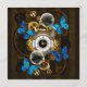 Composición de reloj de vapor redondo con dial numérico romano negro, decorado con arcos de oro y latón, mariposas morfo azules y lentes dañadas sobre fondo rayado marrón. Estilo Steampunk.