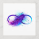 Símbolo infinito con una hermosa pluma pintada de color violeta y azul brillante sobre fondo blanco.