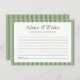 Moda fresca, moderna y sin esfuerzo, esta tarjeta de consejo de boda de rayas verdes es perfecta para captar notas sentidas de los huéspedes. Con un elegante texto en serif, una línea de nombres de personalizable y un espacio limpio y alineado para escribir, es una elegante incorporación a cualquier ducha de novia, boda en el jardín o celebración de pareja. El verde suave aporta un toque natural y relajante, mientras que la disposición lo mantiene intemporal. Un conservador refinado que a tus invitados les encantará completar, y te encantará mirar hacia atrás.