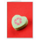 Fotografía de un corazón de caramelo verde menta con un símbolo de reciclaje rojo sobre fondo rojo.