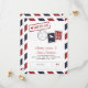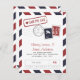 Tarjeta de Save the Date inspirada en correo aéreo en rojo y azul. Falsos sellos y marcas postales para una boda con tema de viaje.