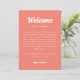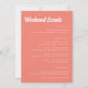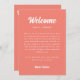 Tarjeta de Cronograma de Fin de Semana de Boda Coral Elegante. Personalice con su mensaje de bienvenida para los invitados, y los nombres de la novia y el novio en letra script en la parte delantera, y su itinerario del fin de semana de la boda en la parte trasera. Puede personalizar aún más este artículo, como cambiar las fuentes, el color de fondo, los colores del texto, etc., haciendo clic en "personalizar esta plantilla", luego "editar con la herramienta de diseño". Por favor, envíe un mensaje al diseñador si desea que se realicen cambios para usted.