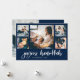 Esta sencilla tarjeta de felicitación familiar para las fiestas con fondo azul marino oscuro y blanco presenta una tipografía moderna e informal que dice "¡Feliz Janucá", con una cuadrícula de varias fotos de cinco fotos en la parte delantera y una más en la parte trasera.