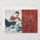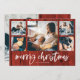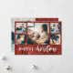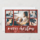 Esta sencilla tarjeta de felicitación navideña familiar rústica presenta una tipografía de letra script informal y trendy que dice "Feliz Navidad", sobre un fondo festivo con aspecto de madera roja. Hay una cuadrícula de varias fotos con cinco fotos en la parte delantera y una más en la parte trasera.