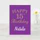 Tarjeta de cumpleaños 15º Purpurina Purple y Gold con nombre personalizado. Para una mayor personalización, haga clic en el botón "Personalizar" y utilice nuestra herramienta de diseño para modificar esta plantilla.