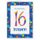 Una tarjeta de cumpleaños 16º brillante y colorida para un gemelo, con números a rayas y un borde estelar, de un diseño digital de Judy Adamson. Puede cambiar el mensaje interno si lo desea.