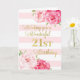 Feliz cumpleaños número 21 con flores color agua rosa, rayas rosas y versos reflexivos.
