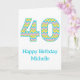 Una tarjeta de cumpleaños luminosa y alegre para un cumpleaños histórico. La parte delantera de la tarjeta muestra el número 40 en un patrón de chevron audaz y moderno. El diseño tiene una paleta de colores alegre y alegre de azul turquesa, rosa, verde y amarillo. Hay un mensaje de feliz cumpleaños junto con el nombre del destinatario que hace que la tarjeta sea especial y única. El mensaje interior dice "¡Es hora de celebrar! ¡Feliz 40 cumpleaños!". Esta tarjeta es la manera perfecta de marcar un cumpleaños histórico.