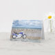 Una motocicleta azul parada en una playa con nubes esponjosas en el cielo. Feliz Cumpleaños escrito en una roca reflejado en el agua que yace en la arena.