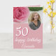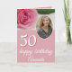 Tarjeta de cumpleaños número 50 de la flor rosa rosa de color rosa. La tarjeta es rosa y tiene una bonita rosa rosa rosa rosa y una foto en un marco redondo en la parte delantera y trasera de la tarjeta. El texto está en un guión blanco de moda. Añade tu nombre, edad y foto y mensaje dentro.