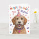 Esta linda tarjeta de cumpleaños de perro de 7 años incluye un lindo perro de Goldendoodle en una imagen gorra de cumpleaños. En la parte delantera, puede personalizar agregando el nombre de la persona que recibe esta tarjeta de cumpleaños. Puedes cambiar el año si quieres (por ejemplo, en lugar de "3er" cumpleaños podría decir "2do" cumpleaños). El gracioso pero lindo mensaje en el interior de esta tarjeta dice "¡Espero que tu cumpleaños sea una patada-increible!". ¡Disfruta de esta tarjeta de cumpleaños dorada rosa y púrpura!