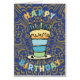 Tarjeta de cumpleaños azul y oro con pastel de cumpleaños feliz con velas.