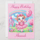 Una hermosa vaca bailarina está celebrando su cumpleaños vestida con un vestido rosado frito con un globo rosa frente a un castillo de cuento de hadas. Personalice la tarjeta con el nombre y la edad de su hijo.