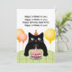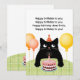 Tarjeta de cumpleaños con gato, pastel de cumpleaños y globos.