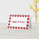 Feliz cumpleaños en una carta blanca de estilo rústico con un borde de manzanas rojas. Diseño de madera y efecto acuarela por Indie Artist WindyDesign.