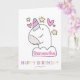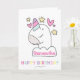 Tarjeta de cumpleaños con nombre personalizado de Unicornio. Feliz cumpleaños texto colorido y animal mágico lindo
