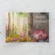 Feliz cumpleaños con una hermosa torta en el bosque con pájaros, flores y árboles.