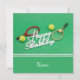 Tarjeta de cumpleaños con raqueta y bola en verde