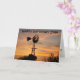 Una silueta de molino de viento con nubes amarillas que son doradas, con siluetas de árboles, que está en una TARJETA.