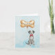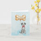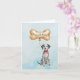 Esta tarjeta de cumpleaños presenta un retrato acuarela de un adorable cachorro dálmata con un arco de cinta roja atado alrededor de su cuello, sosteniendo un globo con forma de hueso de perro dorado con el texto "feliz cumpleaños" escrito a través de él.