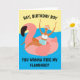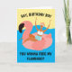 El diseño retro muestra a una mujer en un traje de baño de dos piezas en un flamenco rosa grande, flotando en el océano. El título dice, "'Oye chico de cumpleaños, ¿Quieres montar mi flamenco?