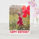 Portada: Dama con globos rojos en el campo. Lecturas: Feliz cumpleaños. En el interior se puede leer: Te deseo un hermoso día.