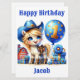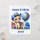 Un adorable poni de vaquero está celebrando su primer cumpleaños con un globo azul con el número 1 y un gorra de vaquero azul en una granja. Personalice la tarjeta con el nombre de su hijo.