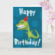 El feliz cumpleaños, lee esta tarjeta de la diversión, perfecta para la gente dinosaurio-cariñosa, y los muchachos jovenes. El dinosaurio es sombras del verde, con un gorra rojo del cumpleaños. El fondo es sombras del azul, con los lunares. El texto es blanco.