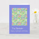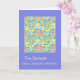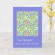 Tarjeta de cumpleaños de bonito de febrero para una hijastra, con un patrón de primrosis rosa profundo, azul profundo y amarillo, la flor del mes de nacimiento de febrero, de un diseño pintado a mano por Judy Adamson.