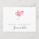 Una tarjeta postal de felicitación de cumpleaños en acuarela que envía amor y deseos desde lejos. Este diseño simple presenta mi flamenco rosa original pintado a mano en acuarela con "Feliz Cumpleaños" en una tipografía moderna y el nombre del destinatario en tipografía de letra manuscrita. Utilice los campos de plantilla para agregar su información personalizada y saludo personalizado. Una elección tropical y sofisticada. Diseñado por Victoria. Para ver más visite www.zazzle.com/dotellabelle