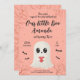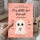 Tarjeta de cumpleaños adorable con tema de Halloween que presenta un fantasma kawaii sosteniendo un corazón rojo, rodeado de murciélagos voladores y detalles espeluznantes pastel. Perfecta para fiestas de octubre para niños, cumpleaños de otoño y celebraciones de Halloween no tan aterradoras. Este diseño de fantasma pastel adorable es dulce, festivo e ideal para agregar un toque de diversión a cualquier reunión de la temporada espeluznante.