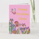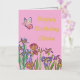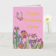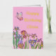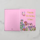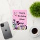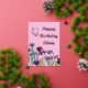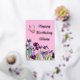 Iris Pumila flor acuarela nombre tarjeta de cumpleaños con fondo rosa claro