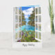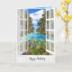 Ventana abierta y cortinas que dan a la piscina y a las palmeras de las Bahamas por su cumpleaños.