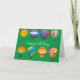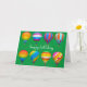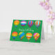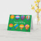 Esta es la tarjeta de cumpleaños para los aventureros a los que les gustaría tomar un paseo en globo aerostático. Un tipo de letra de guión, con el mensaje de feliz cumpleaños en una tarjeta verde con 8 globos de aire caliente de diferentes colores.