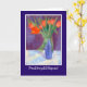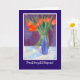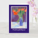 Tarjeta de cumpleaños bonito con "cumpleaños feliz" en galés y un jarrón azul de tulipanes escarlata, de un cuadro de aceite pastel de Judy Adamson.