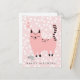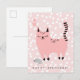 Nueva Tarjeta postal de cumpleaños para niños - ¡Aquí viene el problema! Tarjeta de cumpleaños infantil divertida, con un dulce dibujo animado rosa sobre un fondo rosa con lunares blancos.