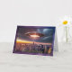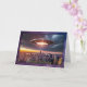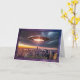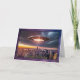 El frente de esta tarjeta de cumpleaños presenta una dramática escena de ciencia ficción de un gran ovni sobrevolando ominosamente el horizonte de la ciudad de Nueva York al atardecer. El cielo es una mezcla de púrpura profundo y naranjas, lo que sugiere una invasión alienígena o un visitante interestelar al atardecer. El Empire State Building ocupa un lugar destacado en el centro, justo debajo de la llamativa y circular parte inferior de la nave espacial, que emite una luz radiante. El icónico horizonte de la ciudad está bañado por la última luz del sol, lo que añade una sensación de grandeza y misterio. Un borde negro decorativo enmarca la imagen con un fondo púrpura estrellado, realzando el tema cósmico. Las palabras "Feliz Cumpleaños" se muestran audazmente en la parte inferior con elegantes letras doradas, añadiendo un toque festivo a esta escena del otro mundo. Esta tarjeta es ideal para un niño que está fascinado por el espacio, los OVNIs y la aventura. Está diseñado para cautivar la imaginación y ofrecer un emocionante saludo de cumpleaños que está fuera de este mundo.