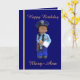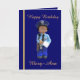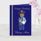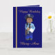 Esta tarjeta está decorada en la parte delantera con una mujer policía blanca y juguete y la palabra "Cumpleaños feliz" y tiene un lugar para los recibos. El interior está decorado con un parche de policía y un saludo de personalizado que se puede cambiar". El panel posterior está decorado con la mujer policía blanca y juguete.