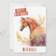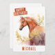 Una linda tarjeta de cumpleaños con un caballo florido celebrando la primavera en el frente con "Feliz Cumpleaños" en una letra negrita blanca y con mayúsculas. Personalice la parte delantera agregando su(s) nombre(s). La parte posterior de la tarjeta contiene espacio para el mensaje escrito a mano o con tipeo.