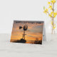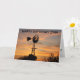 Una silueta de molino de viento con nubes amarillas que son doradas, con siluetas de árboles, que está en una TARJETA.
