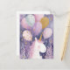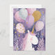 Encantadora tarjeta de cumpleaños con acuarela con un unicornio blanco elegante con crin rosa y cuerno dorado, rodeado de globos pastel rosa, púrpura y dorados en un fondo estrellado mágico. Perfecta para amantes de los unicornios, cumpleaños de niños y celebraciones caprichosas.