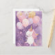 Adorable tarjeta de cumpleaños de acuarela con un unicornio blanco regordete con melena rosa y cuerno dorado, sosteniendo globos rosados y dorados contra un fondo púrpura soñado. Perfecta para niños, amantes de los unicornios y celebraciones mágicas.