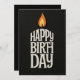 Un diseño de cumpleaños elegante y moderno con las palabras "Feliz cumpleaños" apiladas verticalmente con elegantes letras en crema, formando la forma de una vela. En la parte superior, un naranja cálido y una llama amarilla le dan un punto central sutil pero llamativo sobre un fondo negro profundo. El minimalista estilo de papel cortado y el contraste audaz hacen de esta tarjeta un lugar perfecto para celebrar sofisticados saludos de cumpleaños, especialmente para aquellos que aprecian un diseño elegante y contemporáneo.