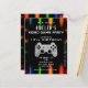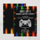 Invitación de cumpleaños de videojuegos con controlador de juego neon. Controlador de juego sobre luces de neón coloridas y vívidas en un fondo negro.